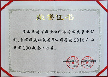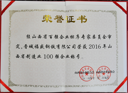 2016年山西省制造業(yè)100強(qiáng)第8名