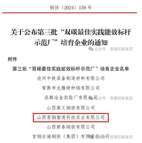 日前,中國鋼鐵工業(yè)協(xié)會公布第三批“雙碳最佳實踐能效標桿示范廠”培育企業(yè)名單,山西晉鋼智造科技實業(yè)有限公司榮耀登榜。