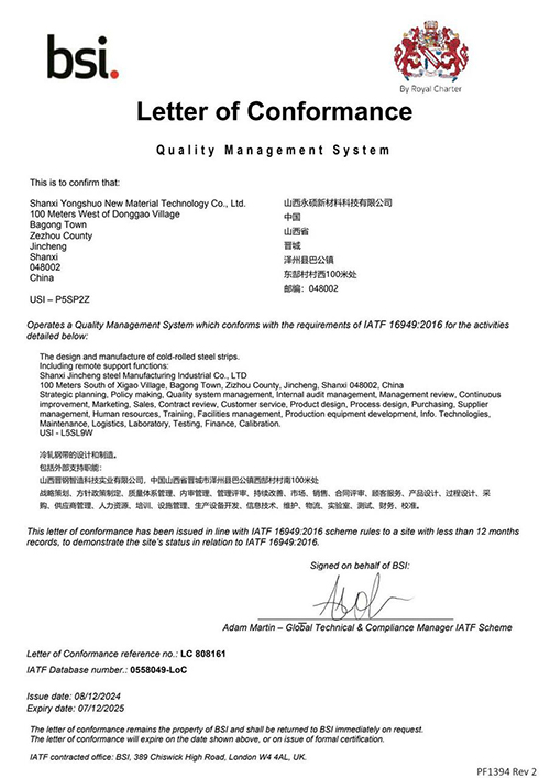 12月10日,歷經(jīng)三個(gè)月的嚴(yán)格認(rèn)證,山西晉城鋼鐵控股集團(tuán)有限公司(以下簡稱“晉鋼”)正式獲得BSI英國標(biāo)準(zhǔn)協(xié)會(簡稱BSI)頒發(fā)的IATF 16949:2016證書。這一權(quán)威認(rèn)證標(biāo)志著晉鋼在汽車鋼質(zhì)量管理方面達(dá)到了國際標(biāo)準(zhǔn)。