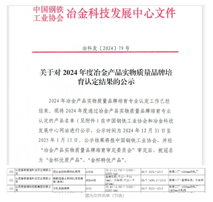 近日,中國鋼鐵工業(yè)協(xié)會正式發(fā)布了《2024年度冶金產(chǎn)品實物質(zhì)量品牌培育產(chǎn)品名單》。經(jīng)過一系列嚴格的申報、初審、專業(yè)認定、公示、異議處理及現(xiàn)場答辯程序,集團的鋼筋混凝土用熱軋帶肋鋼筋(直條)HRB400E、碳素鋼熱軋鋼帶Q355B以及冷軋低碳鋼帶DC01,均榮獲了我國鋼鐵產(chǎn)品實物質(zhì)量水平的最高獎項——“金杯優(yōu)質(zhì)產(chǎn)品”。這一殊榮不僅是對集團近年來在產(chǎn)品質(zhì)量和品牌建設方面的高度認可,更標志著其產(chǎn)品質(zhì)量已經(jīng)達到了國內(nèi)同類產(chǎn)品的領先水平。