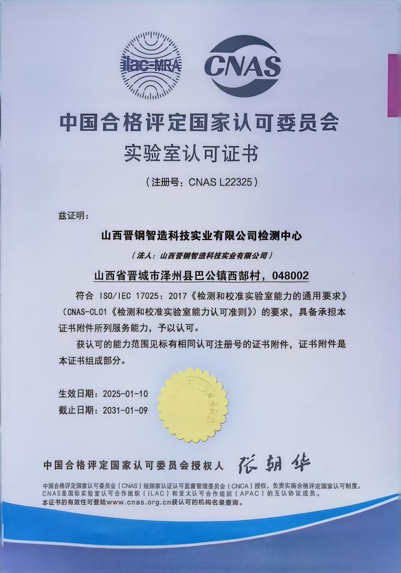 近日,晉鋼智造科技實(shí)業(yè)有限公司檢測中心(以下簡稱“檢測中心”)迎來歷史性時(shí)刻——經(jīng)過中國合格評定國家認(rèn)可委員會(CNAS)專家組嚴(yán)格評審,檢測中心實(shí)驗(yàn)室正式獲得CNAS國家認(rèn)可資質(zhì)!這標(biāo)志著集團(tuán)的質(zhì)量管理體系正式接軌國際標(biāo)準(zhǔn)(ISO/IEC 17025)。檢測中心實(shí)驗(yàn)室以科學(xué)化、規(guī)范化的檢測能力為"晉鋼智造"注入更強(qiáng)品質(zhì)基因。