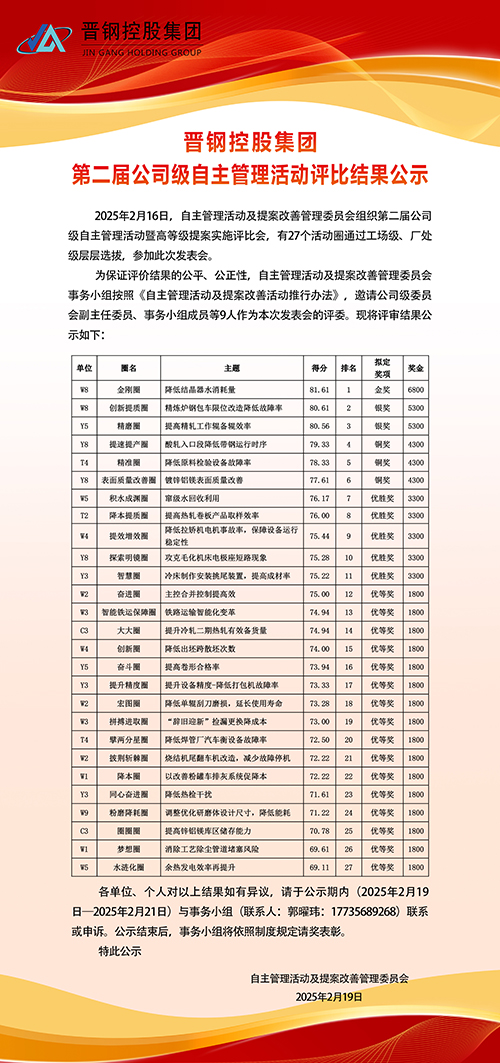 評比現(xiàn)場精彩紛呈,創(chuàng)新創(chuàng)效,可“圈”可點(diǎn)。經(jīng)過激烈的角逐,煉鋼二廠“金剛?cè)Α睌孬@金獎;煉鋼二廠“創(chuàng)新提質(zhì)圈”、熱軋廠“精磨圈”緊隨其后,榮獲銀獎;冷軋廠“提速提產(chǎn)圈”、技術(shù)規(guī)劃發(fā)展處“精準(zhǔn)圈”、冷軋廠“表面質(zhì)量改善圈”獲得銅獎。