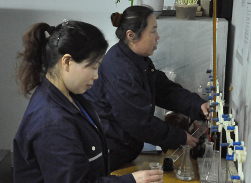 軋鋼廠高線車間丁鳳娥、岳先平在做水處理化驗