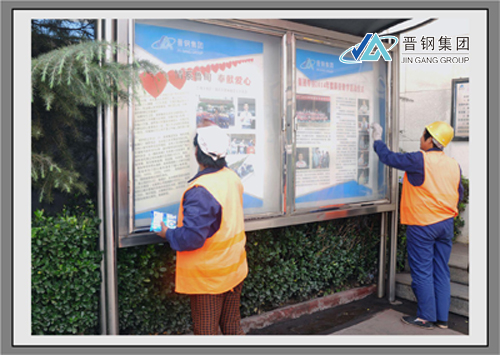 宣傳欄是公司企業(yè)形象的窗口和企業(yè)文化宣傳的前沿陣地,也是員工信息溝通、信息傳遞和汲取文化營養(yǎng)的重要陣地之一。圖為環(huán)衛(wèi)工在清潔宣傳欄。